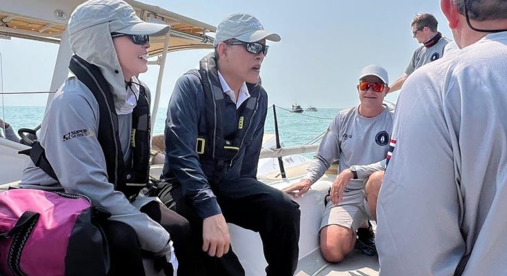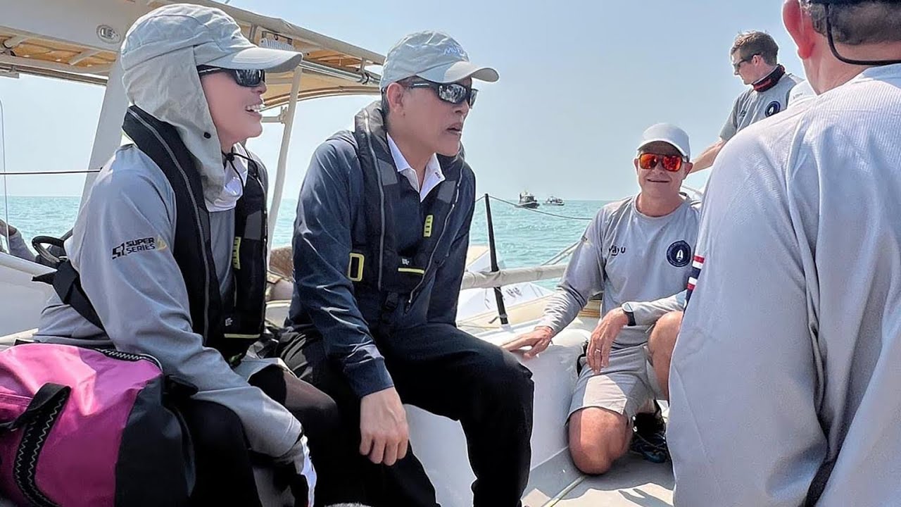 ที่ ชาย หาด เตย งาม เมื่อ สมเด็จ พระ นาง เจ้า พระ บรมราชินี ประทับ เรือ ใบ ท 72 เรียบ ร้อย แล้ว พระ บาท สมเด็จ พระ เจ้า อยู่ หัว ประทับ เรือ ริบ ไป ยัง ชัย หาด โรง แรม เจน ชา อั บีช รีสอร์ เพื่อ เสด็จ พระ ราชดำเนิน ไป ประทับ เฮลิคอปเตอร์ พระ ที่ นั่ง ไป ยัง เรือ หลวง ภูมิพลอดุลยเดช ทอบ พระ เนตร การ แข่ง ขัน เรือ ใบ ข้าม อ่าว สมเด็จ พระ นาง เจ้า พระ บรมราชินี ทรง ทำ หน้า ที่ หลัก คือ บังคับ หาง เสือ เรือ ให้ แล่น ไป ตาม ทิศ ทาง ที่ ต้องการ ก จะ สลับ ไป ทรง ชัก ใบ เรือ ปรับ ใบ เรือ ซึ่ง ใน ครั้ง นี้ ใช้ รูป แบบ การ แล่น เรือ แบบ